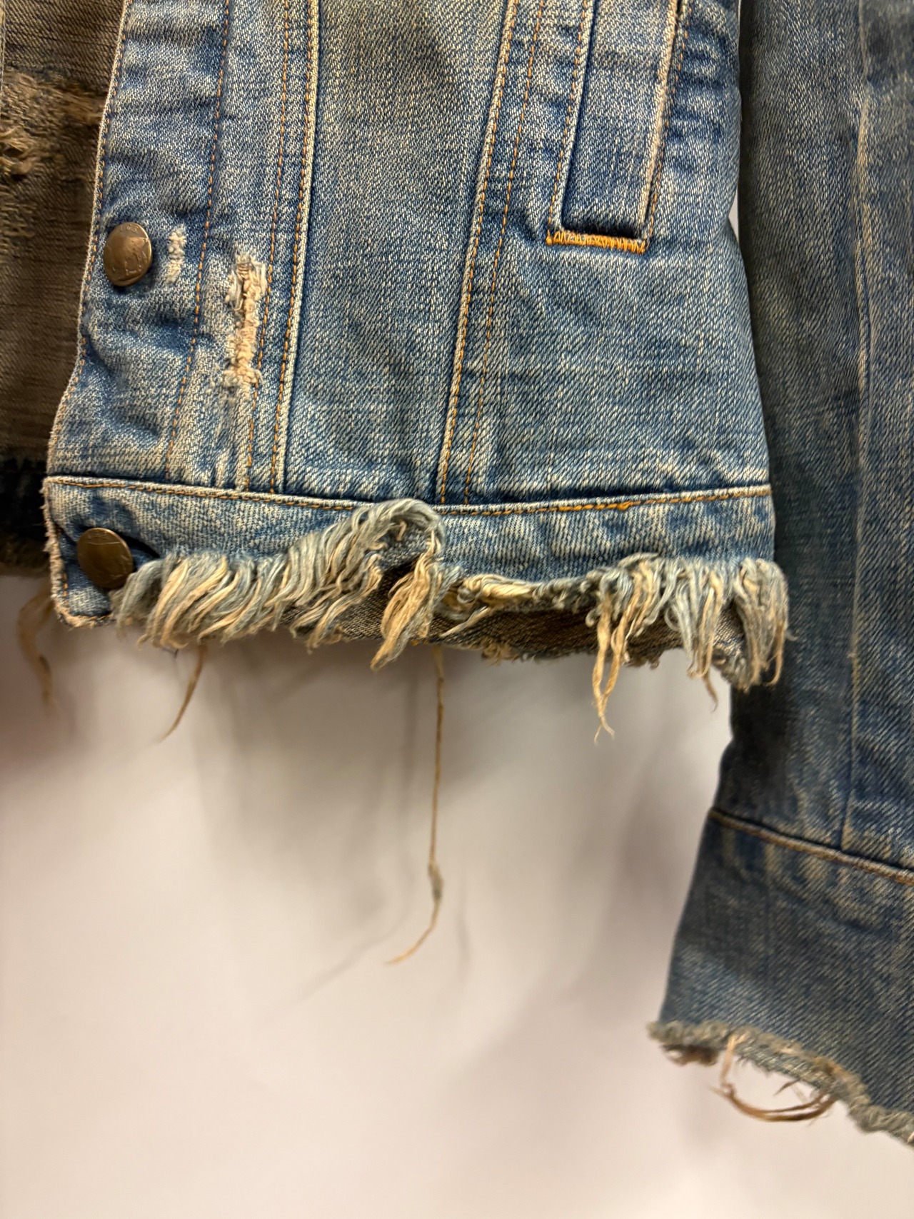 全体に施された大胆なクラッシュ加工やほつれ、擦れなどがリアルで、アヴァンギャルドな存在感を放ちます。