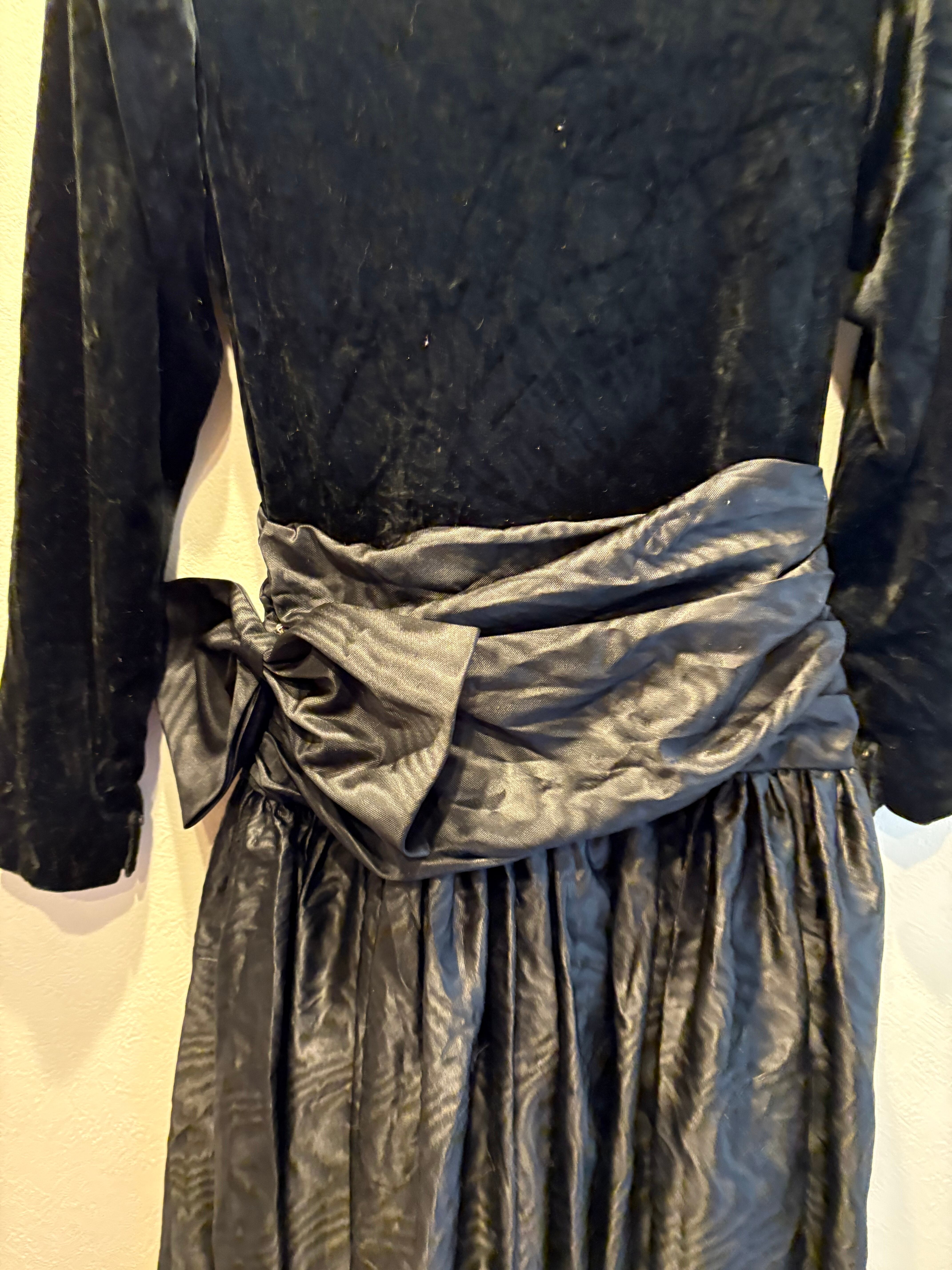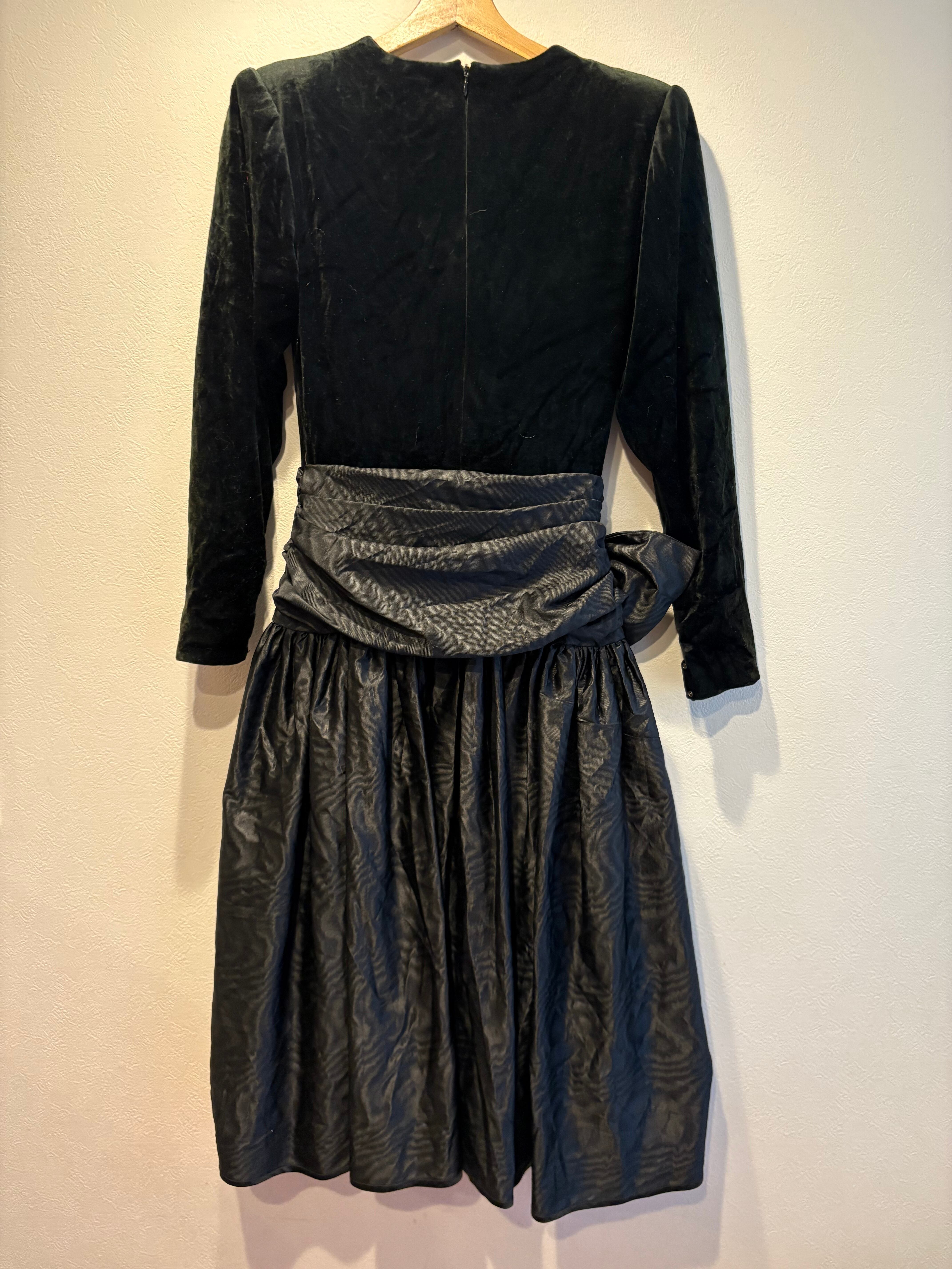 深みのあるベルベット調のトップに、タフタ生地の立体的なドレープとリボンが映える一着です。