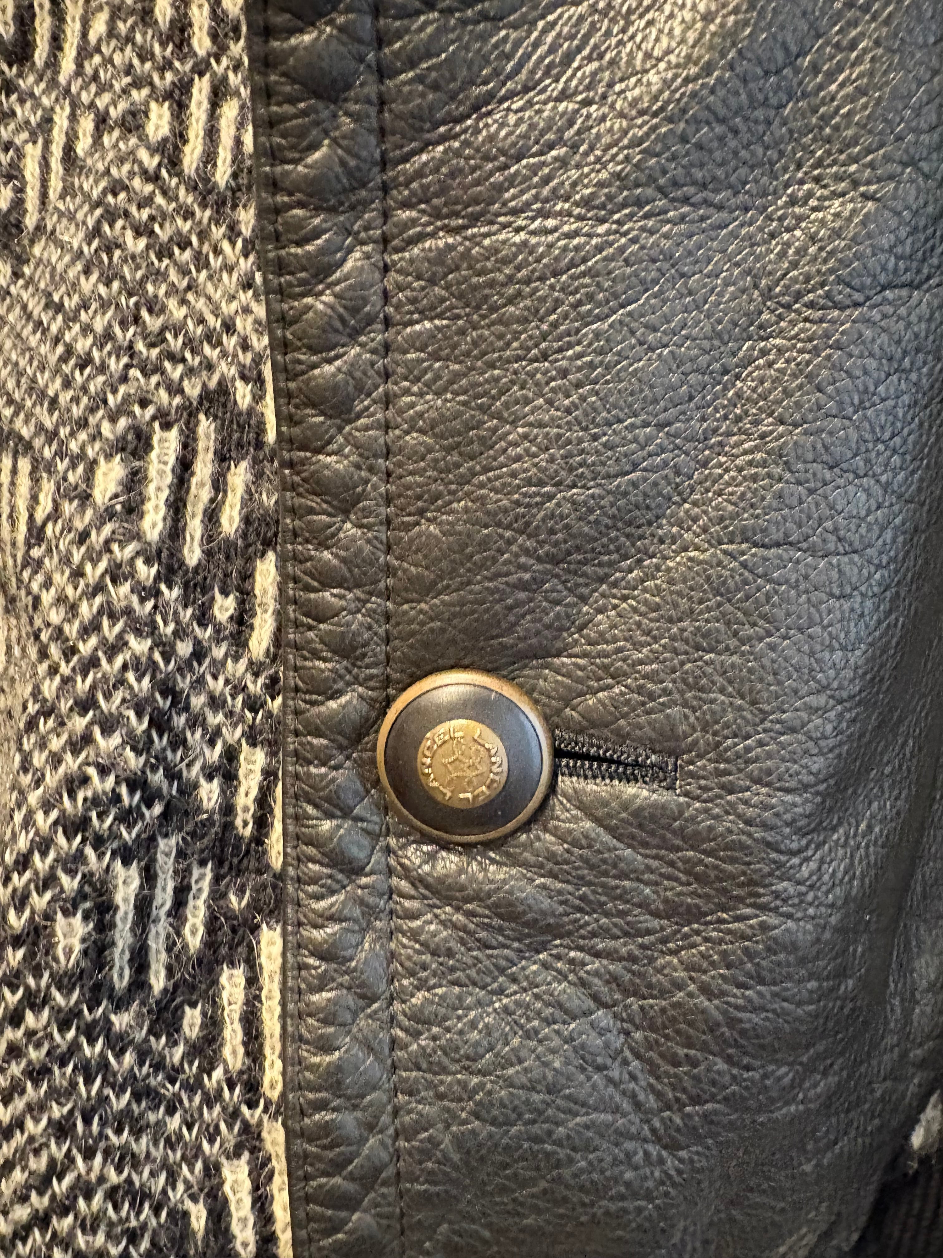 上質な牛革(レザー)の重厚感と、独特の幾何学ジャカード柄ニットが融合した、LANCELらしいラグジュアリーな1着です。