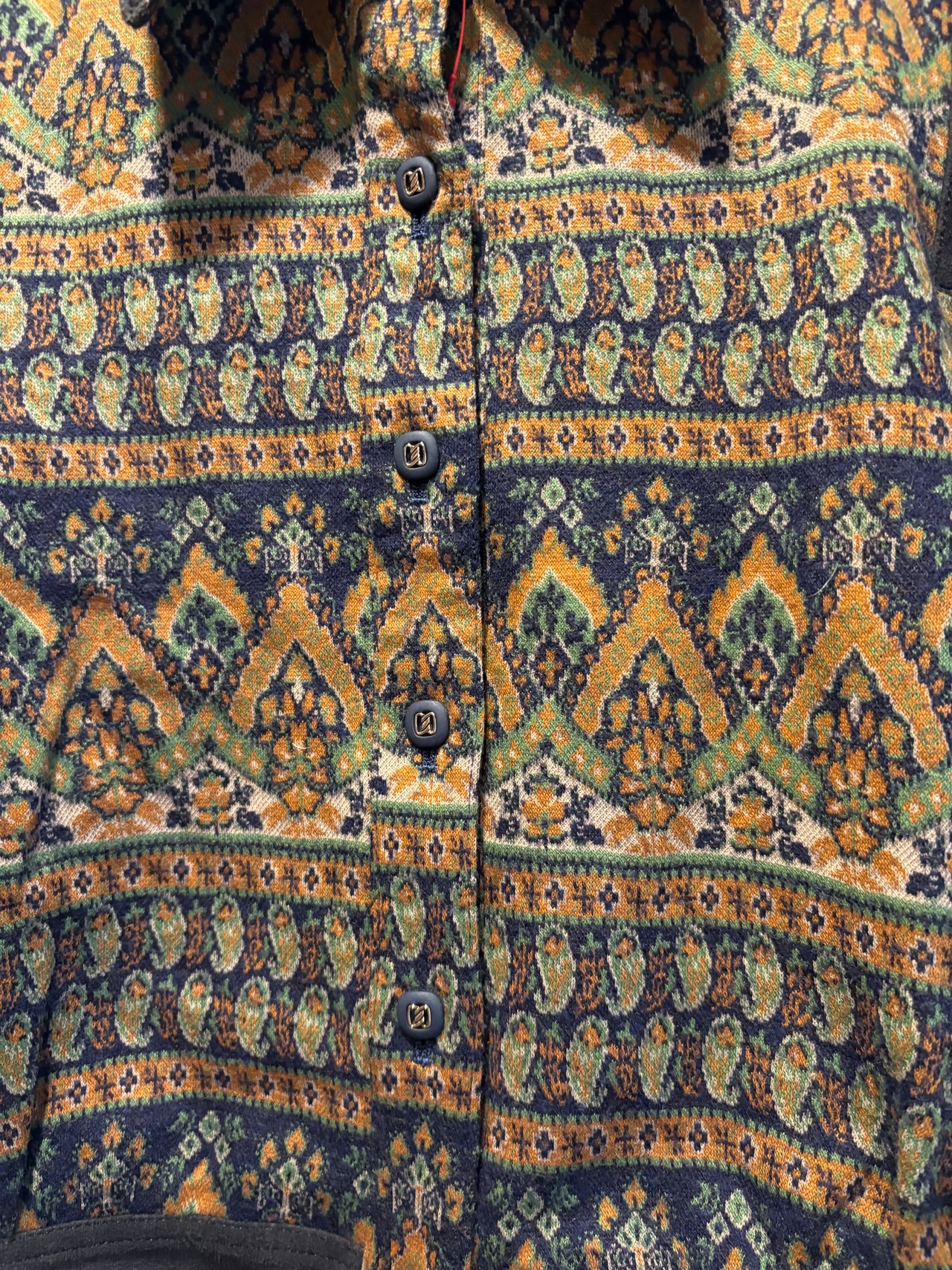 落ち着いたネイビー×イエロー系のカラーリングに、細かなジャガード調パターンがクラシックな雰囲気を引き立てる一着です。